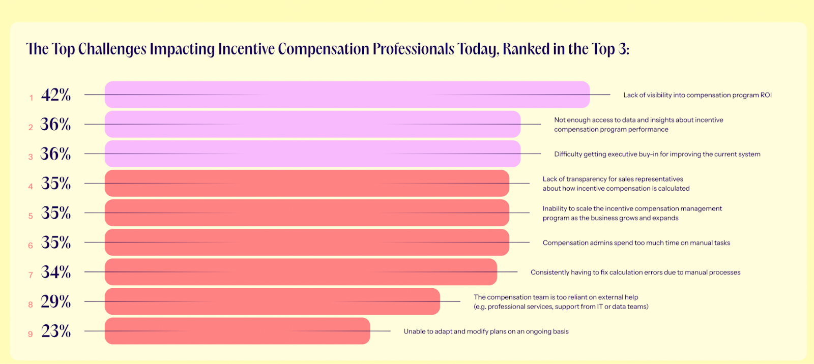 Commission errors and disputes damage trust between sales and finance teams. Our research found that 34% of compensation professionals struggle because they are “consistently having to fix calculation errors due to manual processes.”